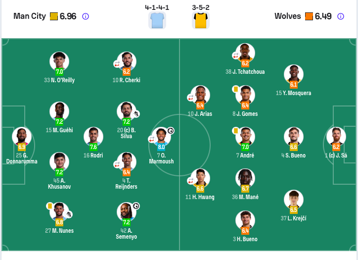 曼城首发:25-多纳鲁马、27-努内斯、45-胡桑诺夫、15-格伊、33-奥赖利、16-罗德里、20-B席、4-赖因德斯(61’47-福登)、42-塞梅尼奥、10-谢尔基(73’11-多库)、7-马尔穆什(73’9-哈兰德)。